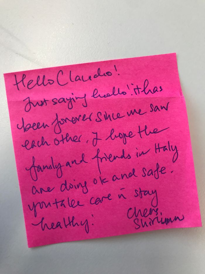 For about one month until today, my company has adopted systematic temperature checks at the office twice a day. Also, the workforce was divided in two teams and only members of the same team were allowed to access the office at any given time. The idea was that if one of the teams was quarantined because one of its members tested positive, the other team could have continued coming the the office if needed. Members of different teams were not allowed to meet inside or outside of the office and this last restriction will remain in place even after the office has shut down. Last Friday, I found on my desk this message from Shirlynn, a friend who I am not allowed to meet.