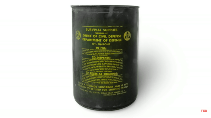When I was a kid, the disaster we worried about most was a nuclear war. That’s why we had a barrel like this down in our basement, filled with cans of food and water. When the nuclear attack came, we were supposed to go downstairs, hunker down, and eat out of that barrel.