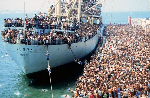 Albanians came by the thousands to Italy in first years of the Nineties. When Nave Vlora reached the shore in Bari with its load of men, women, kids, babies, those of us who saw it on TV or in real, all wondered how it could still stay afloat. In the following days, there were Albanians everywhere. They looked dirty and dangerous: that kind of dirty and dangerous look that comes with years of dictatorship, hunger, suffering, struggle for survival. It was a better Italy: I don’t remember anyone suggesting to sink ships from Albania, back then. We rolled up our sleeves, fed them and cleaned them up. Some of the people that arrived on Nave Vlora, and their families and kids, still live in Italy today.