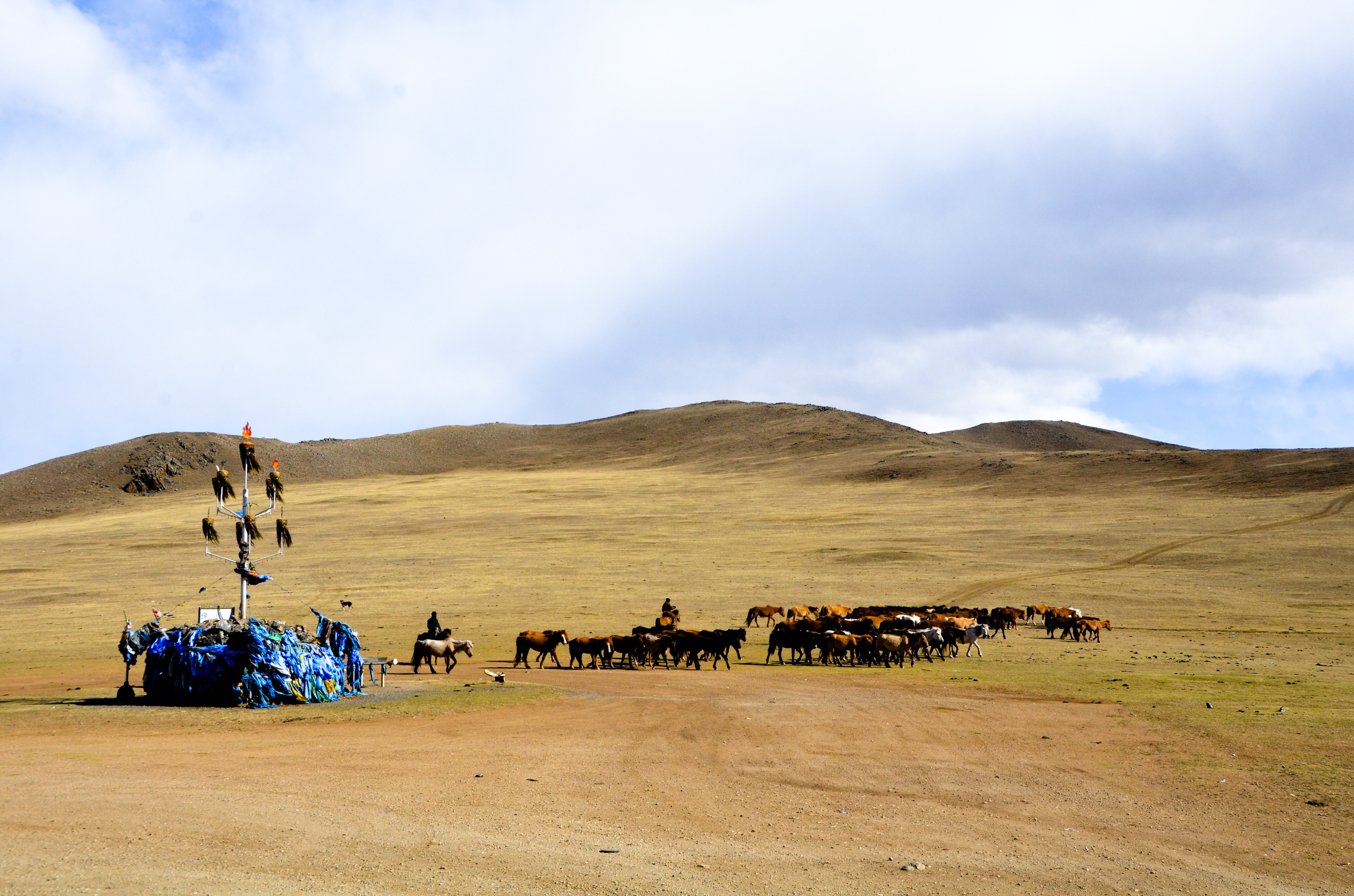 A herd of horses passing by a Ovoo